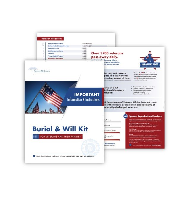 With over 1,700 Veterans passing away daily, knowing exactly what you are covered for and entitled to is of the utmost importance. That’s why we created the Will Kit and Burial Guide for Veterans. This resource includes a Family Information Guide and a Last Will and Testament Kit to ensure your family is protected and prepared for the future.